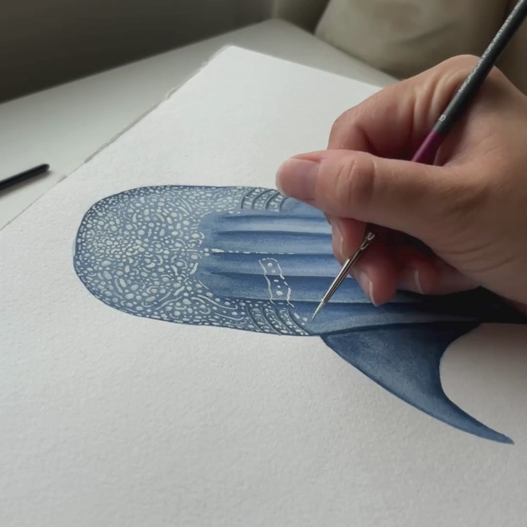 'The Gathering' is inspired by my time on the Nyinggulu (Ningaloo). Swimming through the crystal blue water next to the largest shark species in the world during their annual migration is something I'll never forget. This World Heritage Area will forever have a special place in my heart. With this print, I hope you too can make your own special connection and bring your love for the beautiful whale sharks and manta rays into your own home.